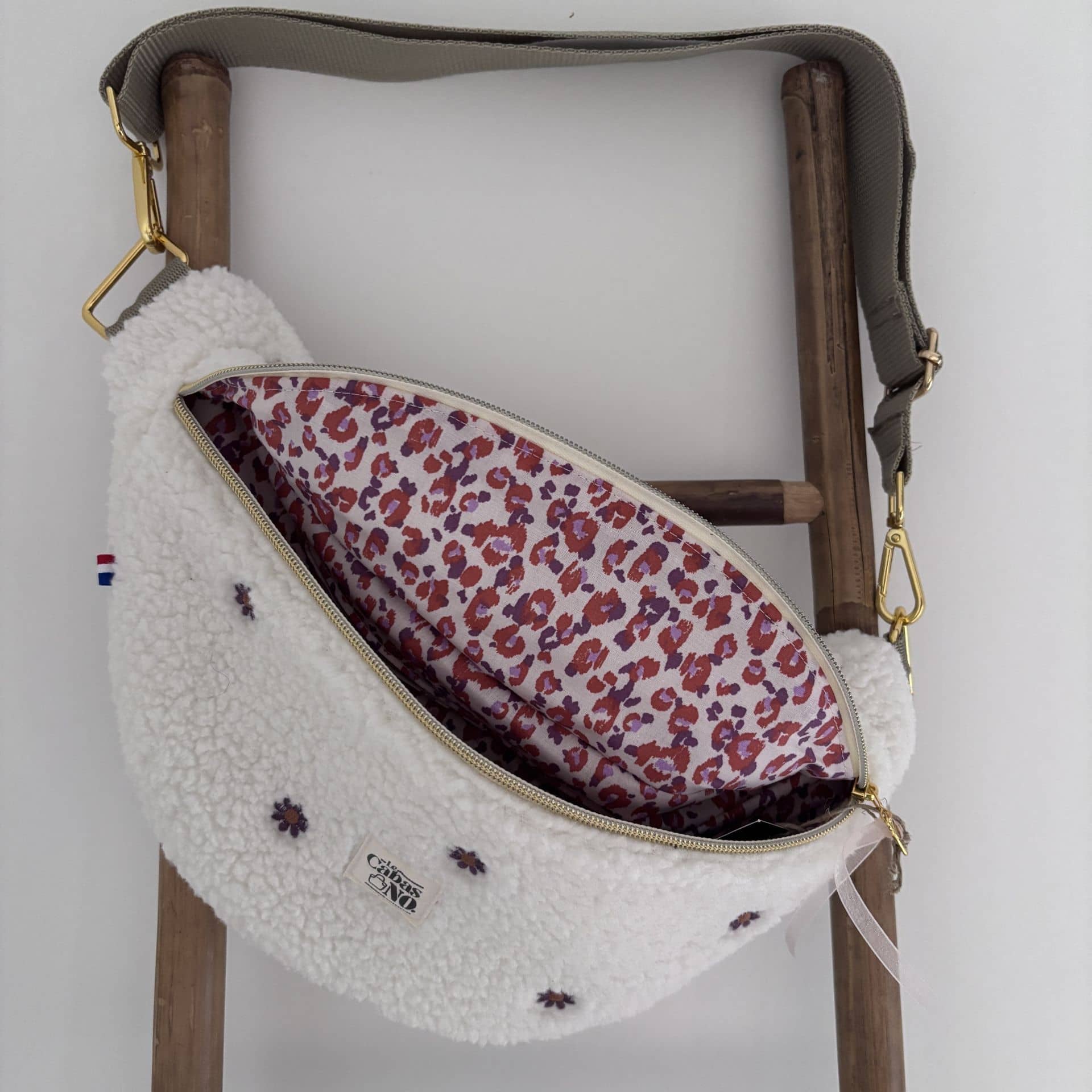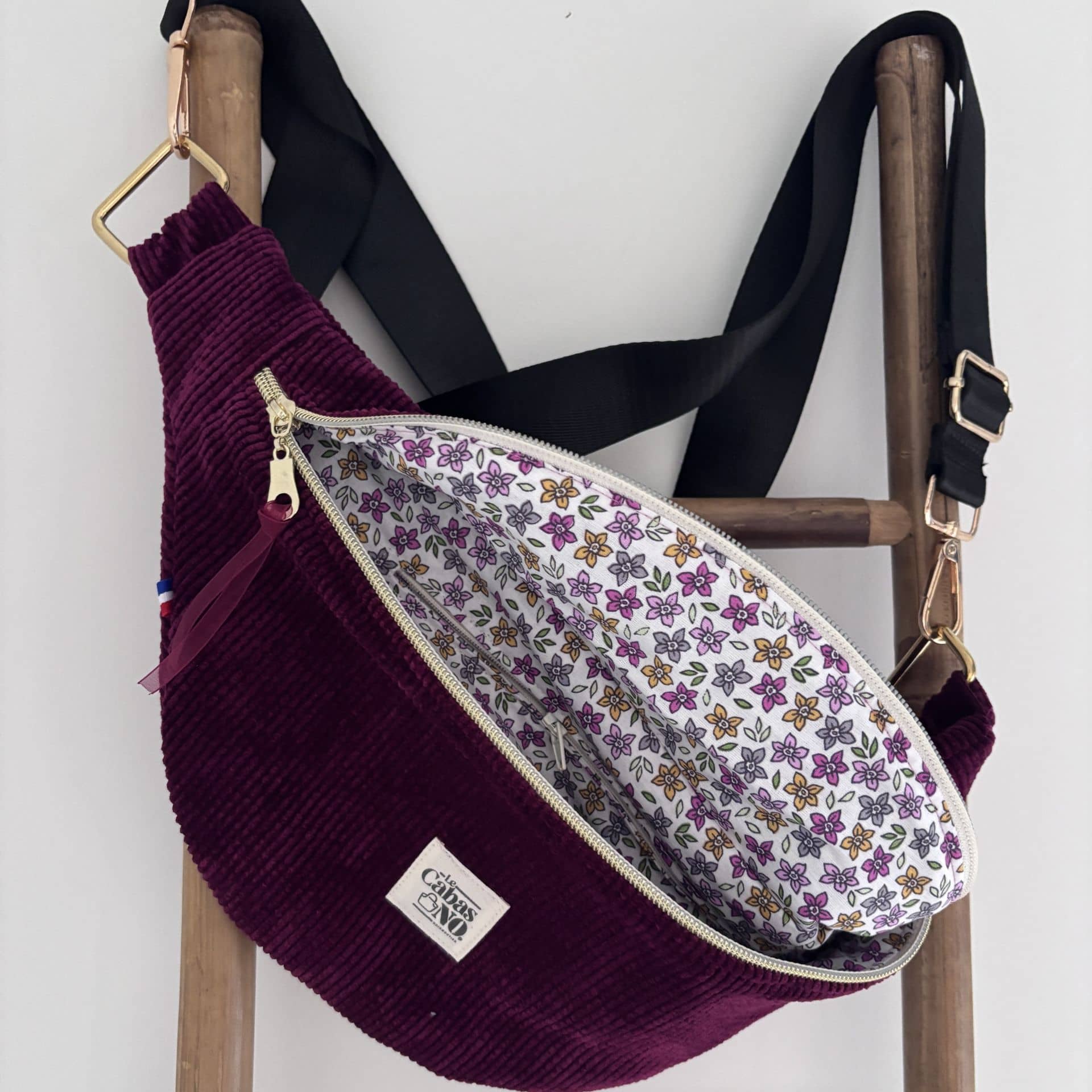 Elodie, c’est le sac banane pratique, stylé et 100% fait main, en velours côtelé bordeaux et sa doublure tissu coton fleuri. Son anse réglable vous permet de la porter aussi bien sur un vêtement épais en hiver que sur un tee-shirt en été. Sa fermeture éclair en zip super pratique vous permettra de porter votre sac banane en bandoulière.